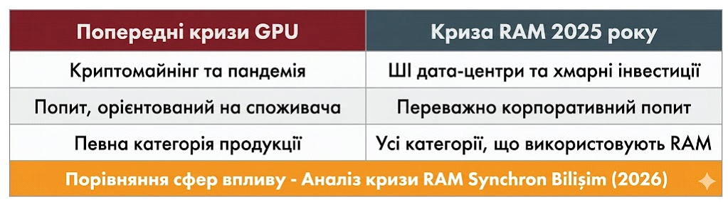 Для тих, хто пам’ятає попередні кризи GPU, ця картина на перший погляд може здатися знайомою. Проте нинішня RAM-криза структурно відрізняється від попередніх дефіцитів відеокарт: